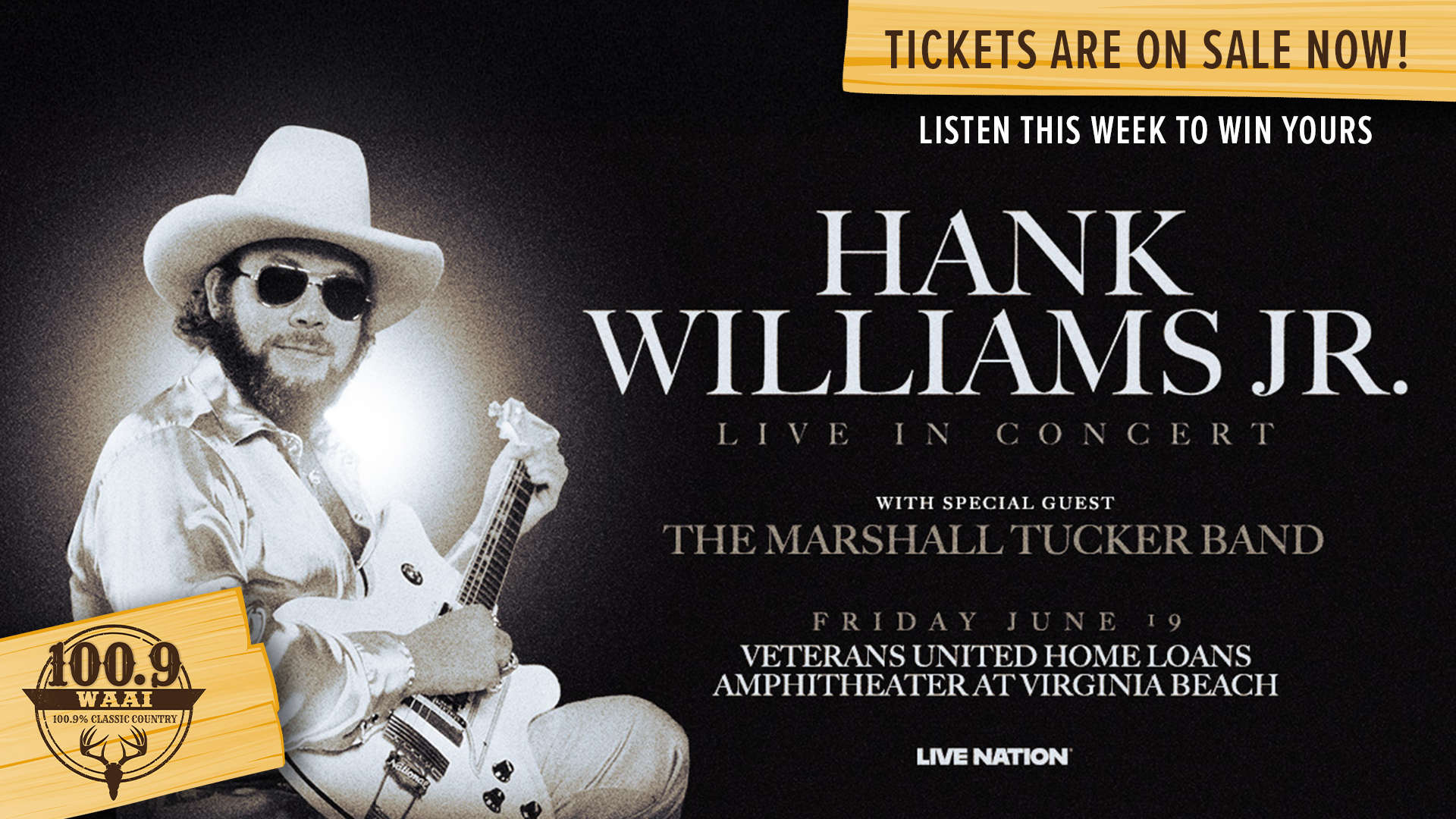 TICKETS ARE ON SALE NOW FOR HANK WILLIAMS, JR. WITH THE MARSHALL TUCKER BAND ON FRIDAY JUNE 19TH AT THE VETERANS UNITED HOME LOANS AMPHITHEATER AT VIRIGINA BEACH! YOU CAN SECURE YOUR TICKETS NOW BY CLICKING HERE!